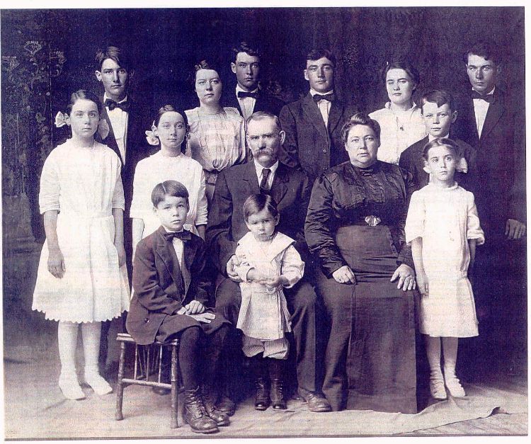 (back) - Bernard, Nell, Tom, Ed, Mary and Jim. (middle) - Kate, Agnes, Lawrence, Mary Agnes, Donald. (foreground) - Gerald, Leo, and Frances. Bio: Lawrence Walsh was born August 07, 1864 in Washington township, Dubuque Co., Iowa, the son of Edmund and Mary Frances (Walsh) Walsh. About 1884 his parents moved to a farm in Pottawattamie County, Iowa. Mary Agnes Burns was born December 05, 1870 in Pottawattamie County?, Iowa, the daughter of Edward and Bridget (Lambert) Burns. Lawrence and Mary Agnes married May 25, 1891. They had a total of 13 children, including infant son John Walsh who died in January, 1901. |